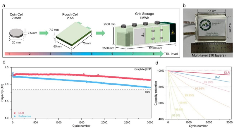 图2 DLR基软包电池的循环性能。a) 从扣式电池(2mAh)到电网存储集装箱(1MWh)的示意图。b) 2.3 Ah石墨-LFP软包电池光学图像。c) 2.3 Ah DLR基石墨-LFP软包电池的循环性能。d) 平均CE值对LIB容量保持率的影响。