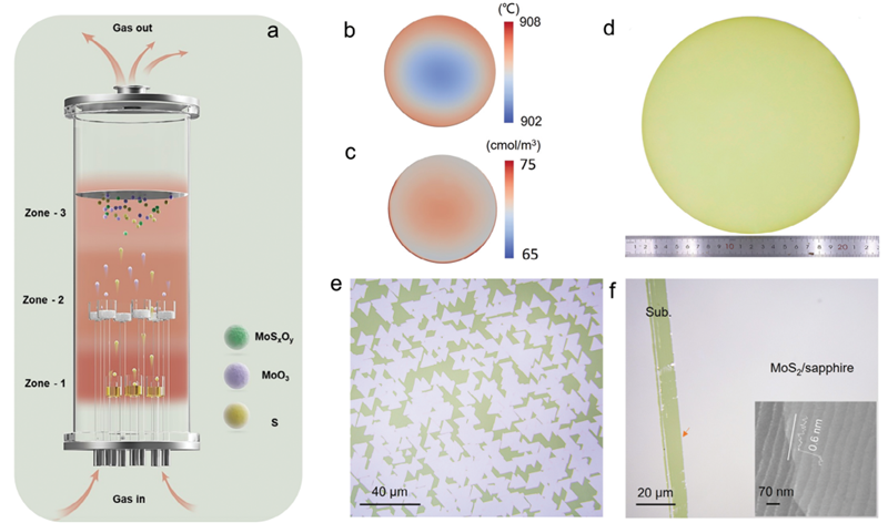 图1. 八英寸垂直化学气相沉积系统及8英寸晶圆上外延得到的单层MoS2薄膜
