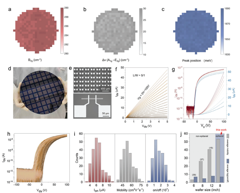 图3.单层8英寸单层MoS2薄膜均一性表征及其场效应晶体管电学性能统计