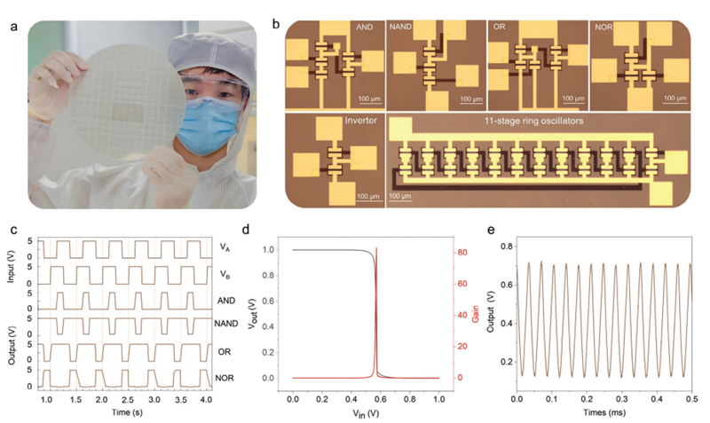 图4.基于8英寸单层MoS2薄膜的各种逻辑器件及11阶环形振荡器性能测试