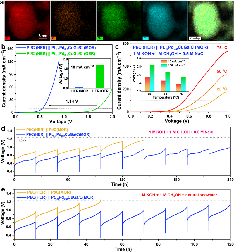 图1. (a)Pt1.8Pd0.2CuGa/C i-NPs的元素空间分布图。(b)在含有甲醇和和不含甲醇的碱性海水电解液中电解的极化曲线。(c)不同温度下“MOR + HER”耦合电解海水的极化曲线;“MOR + HER”耦合电解海水制氢的稳定性测试:(d)碱性模拟海水;(e)碱性天然海水。