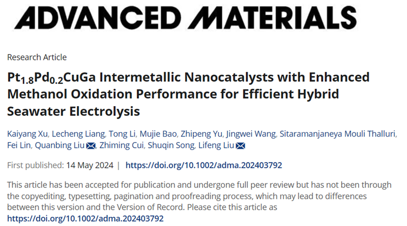 本工作以“Pt1.8Pd0.2CuGa Intermetallic Nanocatalysts with Enhanced Methanol Oxidation Performance for Efficient Hybrid Seawater Electrolysis”为题于2024年5月11号发表在领域内知名期刊《Advanced Materials》上。能源转换与存储材料团队与广东工业大学联培硕士生徐凯洋为文章的第一作者,团队刘利峰研究员、广东工业大学大学刘全兵教授为文章的共同通讯作者。