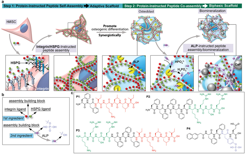 图一. 逐步构建用于hMSC成骨分化的自适应双相支架。a) 自适应双相支架的示意图,由hMSC组装并涵盖成骨分化过程。b) 两种用于顺序蛋白指导肽组装的肽的设计示意图。c) 本研究中应用的合成肽的化学结构。