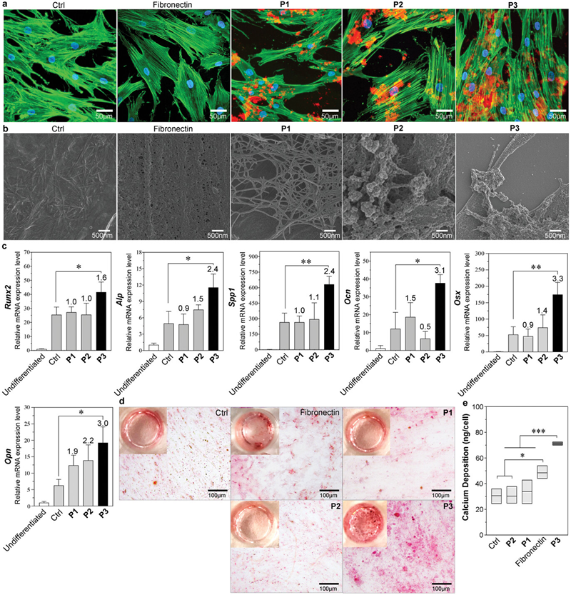 图二. 双靶向组装肽在hMSCs的顶膜上原位自组装,促进成骨分化