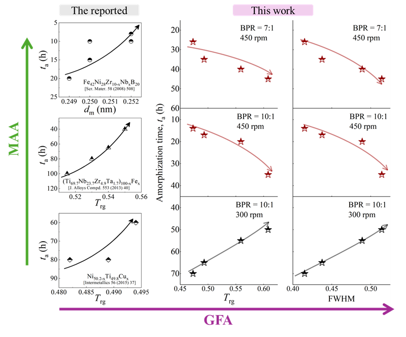 目前,形成非晶的途径可大致分为两类:一类是通过将无序状态保留而形成的非晶固体,如从气体到固体的气相沉积、磁控溅射以及最常见的通过液体快冷所导致的玻璃转变等; 另一类非晶形成是通过将有序状态无序化,常见的如超声振动、高速冲击、球磨非晶化等。前一个途经可以通过玻璃形成能力(Glass Forming Ability,GFA)来衡量非晶形成过程,而后一个过程是有序到无序的转变,需要借助应力等外场能量的注入,因此需要利用力致非晶能力(Mechanical Amorphization Ability, MAA)来衡量, 长期以来,人们普遍认为GFA与MAA具有正相关的联系,即体系GFA越好,MAA越高,但其中的理论依据及关联程度并不明晰。