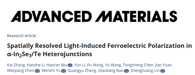 相关研究成果以“Spatially Resolved Light‐Induced Ferroelectric Polarization in α‐In2Se3/Te Heterojunctions”为题发表Advanced Materials上(Adv. Mater., 2024, 2405233)。其中,张凯(联培硕士生)、李浩哲(联培博士生)及沐浩然(副研究员)为第一作者,松山湖材料实验室林生晃研究员、沐浩然副研究员、上海理工大学鲍桥梁教授以及华南师范大学陈伟强教授为论文共同通讯作者,松山湖材料实验室为第一通讯单位。