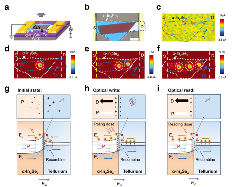 图 1 极化前后 α-In2Se3 异质结的空间分辨扫描光电流图及能带结构。(a) 器件的三维示意图, (b) 异质结的光学图像。(c-f) 在自供电模式下,异质结在极化前后的空间分辨扫描光电流图。(g-i) 零偏置电压下的 "强光写入和弱光读取" 机制。