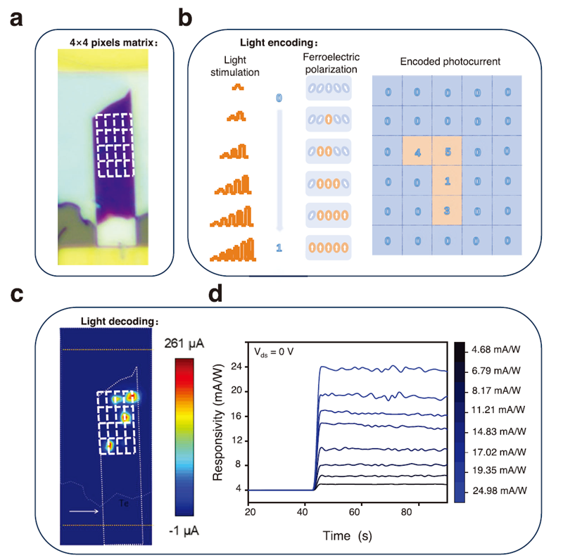 图 2.展示了视觉传感器阵列中的光编码和解码过程。(a) 4 × 4 像素矩阵:其中的 α-In2Se3/Te 光电探测器阵列被设计成视觉传感器。该阵列可执行图像感应和记忆功能。(b) 光编码。(c) 光解码。(d) 探测器在不同时间零偏压光刺激(波长 520 nm,强度 11.3 μW cm-2)下的响应。