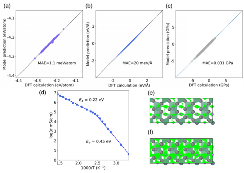 我国虽然有很多类似的项目及模型,但都采用欧美的开源数据集,无法从根本上实现自主可控,更无法实现超越。GPTFF模型的训练数据源自自研的Atomly材料数据库(https://atomly.net/),包含近35万个无机材料数据,数据规模和质量位于世界顶级水准,知识产权自主可控。是我国唯一可对标欧美竞品的无机材料数据库。GPTFF的训练数据包含3780 万个单点能量、117 亿个力对和 3.402 亿个应力,数据具有高度的标准和一致性,保证了模型的高精度和强泛化能力。GPTFF 能够实现对原子间相互作用的精确预测,原子间能量、受力以及应力的预测精度分别达到 MAE=32meV/ 原子、71 meV/Å 和 0.365 GPa,优于m3gnet 和 CHGNET (图1)。可用于模拟晶体结构弛豫、固态电解质中的离子疏运、金属在应力下的相变等科学问题 (图2)。