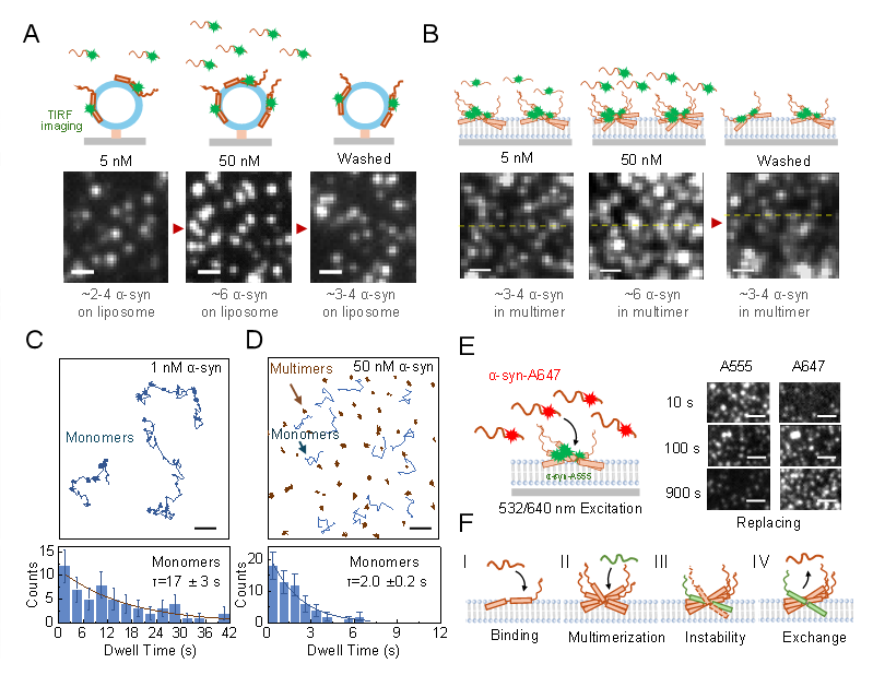 (A). α-突触核蛋白在囊泡上的有限吸附。 (B). α-突触核蛋白在平面磷脂膜表面的自限性聚集。(C). 1 nM浓度下,α-突触核蛋白单体在平面膜表面的运动轨迹(上图)及其在膜表面的驻留时间(下图)。(D). 50 nM浓度下,α-突触核蛋白单体(蓝色)及聚集体(棕色)在平面膜表面的运动轨迹(上图)及单体在膜表面的驻留时间(下图)。(E). Alexa Fluor 647标记的α-突触核蛋白对膜表面Alexa Fluor 555标记的α-突触核蛋白聚集体内部单体的替换。(F). α-突触核蛋白通过聚集体内部单体的动态交换限制其自身生长的机制。图中比例尺:1 μm。
