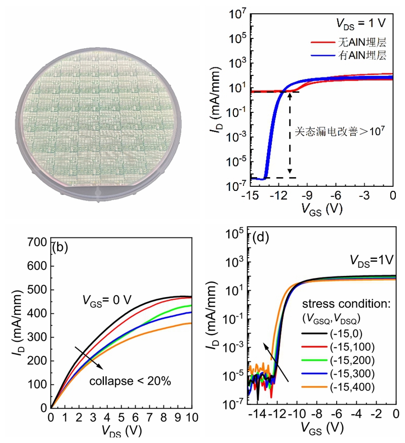 图:基于6英寸AlN单晶复合衬底制造的GaN晶圆,转移特性曲线,动态输出特性曲线和动态转移特性曲线
