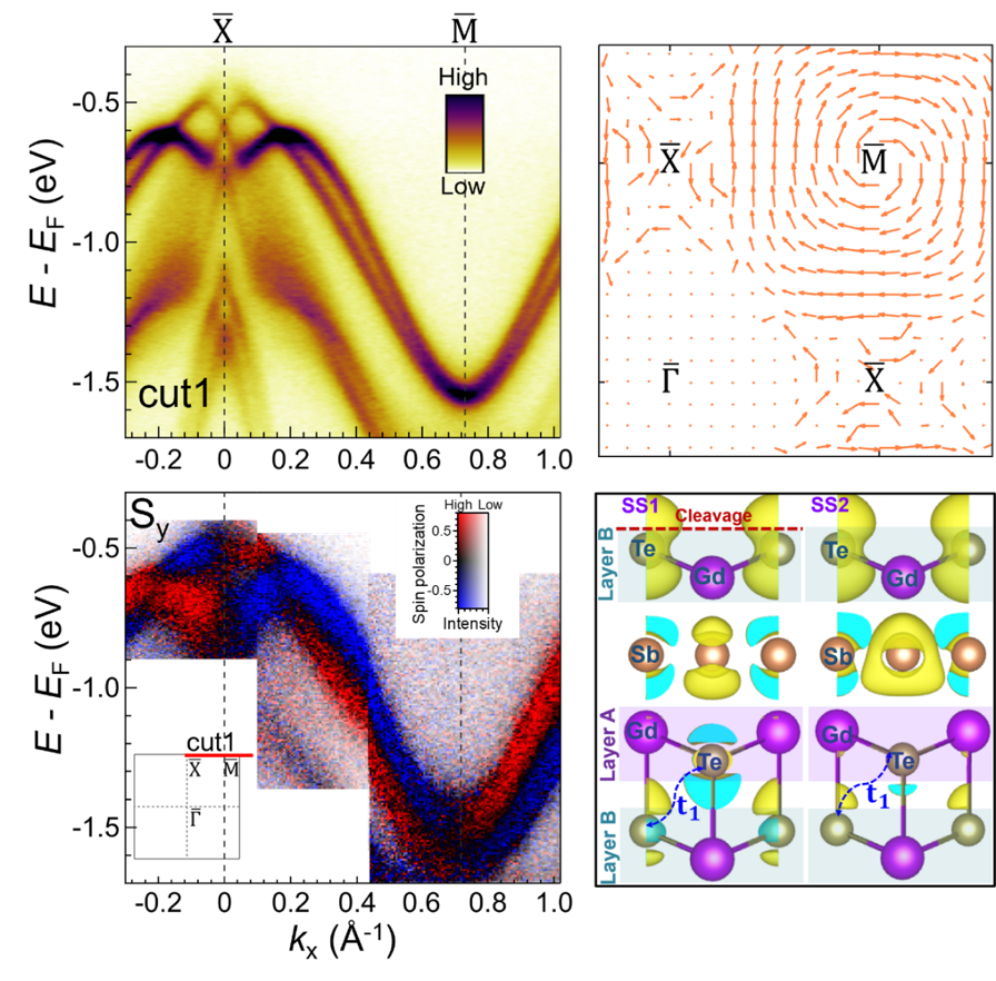 图一:左上:ARPES测量到的悬挂键表面态能谱。左下:自旋分辨ARPES测量得到的悬挂键表面态自旋极化能谱。右上:第一性原理计算得到的自旋动量纹理。右下:计算分析得到的悬挂键表面态的电子态密度分布。