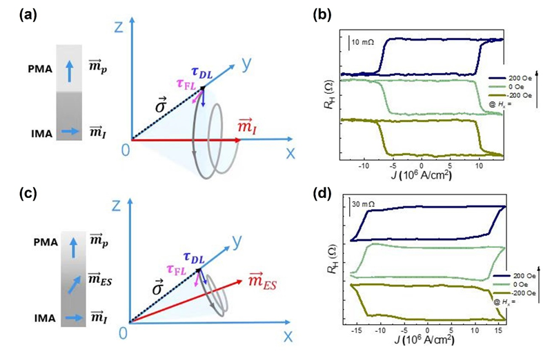 零外场、低功耗的全电学磁性信息写入方式是开发自旋电子器件的关键,特别是在磁性随机存储器(MRAM)领域。目前,基于铁磁体中自旋极化电流的自旋转移力矩(STT)机制作为一种高效磁性信息写入的方法,已被广泛应用于商用化的STT-MRAM芯片。近年来,研究人员对强自旋轨道耦合材料的自旋轨道力矩(SOT)表现出极大兴趣。相比STT,基于SOT的读写分离的三端SOT-MRAM中具有独特优势,从而显著提高器件的耐用性。为了实现垂直磁性的零外磁场SOT驱动磁化翻转,通常需要打破结构、晶格或自旋纹理的对称性,以诱导z方向分量的自旋极化和自旋力矩。然而,在传统材料体系中,自旋极化的调控面临诸多挑战,如材料的不均匀性,与CMOS工艺的兼容性以及器件扩展性等问题。在此背景下,非共线交换弹簧作为一种新型磁结构单元,为探索和实现可调控的自旋极化提供了新思路。