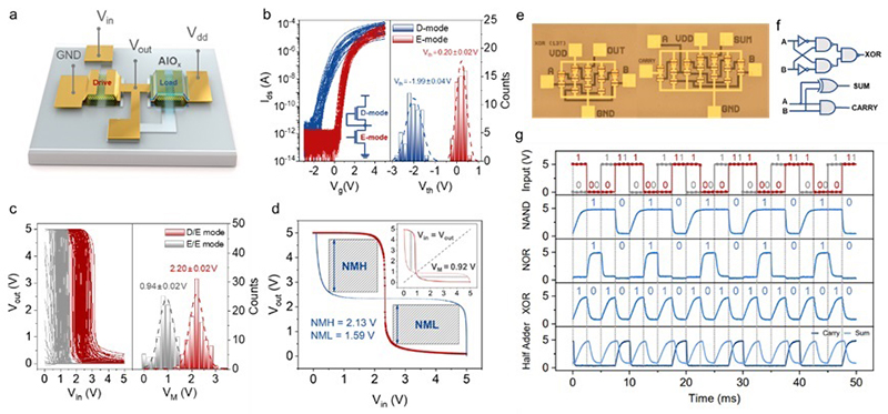 近年来,松山湖材料实验室二维材料团队和中国科学院物理研究所N07课题组联合在柔性二维电子器件研究方面取得了一系列重要进展?;诙氲继宀牧系娜嵝缘缱悠骷唤稣瓜殖龈咝阅苡氲凸牡挠攀?,还在柔性显示驱动和人工视网膜等领域显示出广阔的应用潜力[Nat. Electron. 3, 711 (2020); Nat. Commun. 14, 3633 (2023); Nano Lett. 23, 9333–9339 (2023); Nano Lett. 17, 991–999 (2023)]。在最新研究中,二维材料团队与N07课题组联合培养的彭雅琳博士和崔晨阳博士等人通过协同优化器件加工工艺,基于二硫化钼薄膜首次在国际上成功实现了柔性中规模集成电路的制备。利用阻抗调制技术,分别实现了增强型与耗尽型晶体管,设计开发了具有稳定轨到轨操作和优异噪声容限的NMOS反相器。在此基础上,构建了组合逻辑与时序逻辑共存的数字电路系统,包括半加器、锁存器、触发器以及由112个晶体管组成的中规模时钟分频器,为柔性数字集成电路的实际应用奠定了坚实的基础。