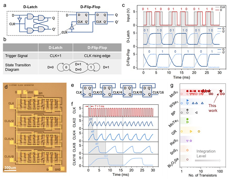 在此背景下,二维半导体材料凭借其卓越的电学性能、优异的机械柔性以及良好的生物兼容性,为柔性集成电路的研发提供了全新思路。目前,基于二维半导体的柔性集成电路主要实现了基本逻辑门和环形振荡器,其最大集成规模仅为24个薄膜晶体管,这使其仅能支持简单运算,在电路规模和功能性方面与实际应用需求仍存在显著差距。为进一步挖掘柔性二维集成电路的潜能,亟需显著提升器件的集成规模,并在单芯片上实现组合逻辑与时序逻辑电路的多功能数字电子系统集成,从而使数百至数千个晶体管协同工作成为可能。