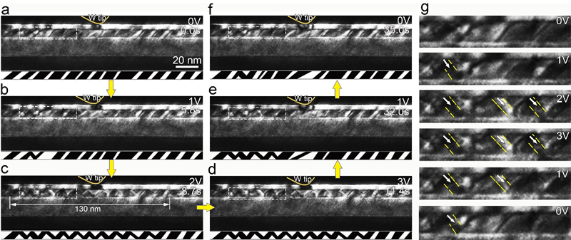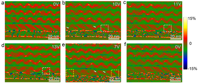 图3 (PbTiO3/SrTiO3)5多层膜中电场加载铁电全闭合畴的产生与湮灭过程。(a-d) 随着外加电场的增加,可观察到从原a畴中发生c畴的形核与长大,并逐渐转变成全闭合阵列。(e-f) 随着外加电场的减小,全闭合阵列逐渐恢复为a/c畴。