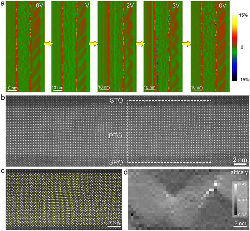 图2 原子尺度原位STEM成像揭示a/c畴到全闭合的转变。(a) 原子尺度原位STEM成像结合应变分析揭示外场作用下全闭合畴的产生与湮灭过程。(b-d) 电场加载下全闭合畴的极化(c)和应变(d)分布。