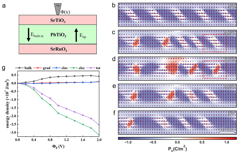 图1 PbTiO3/SrTiO3双层膜中外加电场实现铁电全闭合畴的产生与湮灭。(a-d) 随着外加电场的增加,a/c畴逐渐转变成全闭合阵列。(e-f) 随着外加电场的减小,全闭合阵列逐渐恢复为a/c畴。