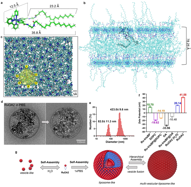 图2. RuOA?在水相环境中的动态自组装行为。(a) RuOA?分子的空间构型及关键结构参数。(b) 基于分子动力学(MD)模拟结果展示RuOA?单体(128个)在3200个水分子中的双分子层截面图。大部分RuOA?分子以线框模式显示,其中一分子以棒状模式高亮显示。(c) 双分子层的顶视图,黄色标注为Ru中心之间的分子间距,对应数值为12.31、9.81、12.62、9.87、9.94 和 11.25 Å。(d) RuOA?自组装形成的钌小体(ruthenosome)在PBS溶液中的透射电子显微镜(TEM)图像。左图为弱电子束照射下的形态,右图为持续电子束辐照数分钟后的形态变化。(e) RuOA?在1×PBS缓冲液中的粒径分布,采用动态光散射(DLS)分析获得。(f) Ru-trisBP、DOPC、OA、Ru-trisBP@DOPC、Ru-trisBP@OA及RuOA?在1×PBS(20 μM浓度)条件下的Zeta电位测试结果,并与RuOA?在纯水中的表现进行对比。数据以平均值 ± 标准差表示(n = 3)。(g) RuOA?在水相环境中的动态自组装过程示意图。
