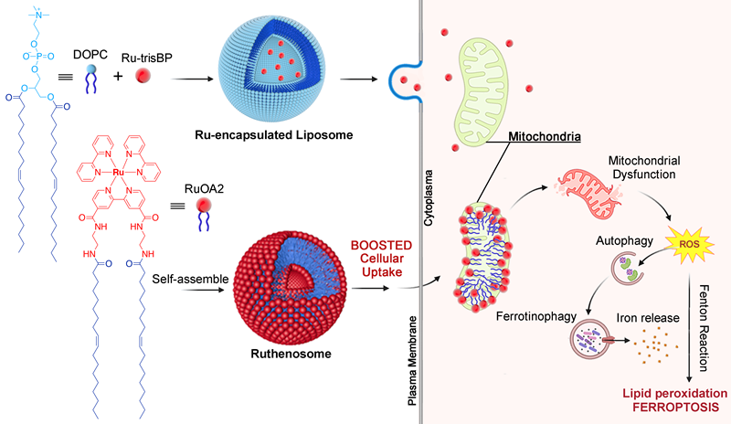 图1. 钌配合物通过自组装形成Ruthenosome,诱导铁死亡的示意图。包括Ru-trisBP包载脂质体和RuOA?自组装Ruthenosome的制剂方案。Ruthenosome通过增强RuOA?的细胞摄取和线粒体靶向,促进ROS产生,进而触发铁死亡。
