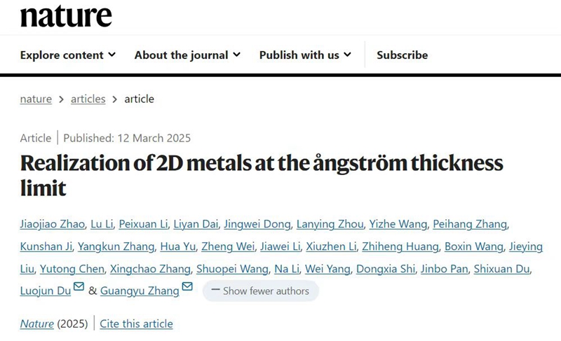 相关研究成果以“Realization of 2D metals at the ångström thickness limit”为题发表在Nature。中国科学院物理研究所N07组与松山湖材料实验室二维材料团队联合培养的博士生赵交交(已毕业)为该论文的第一作者,中国科学院物理研究所/松山湖材料实验室张广宇研究员和中国科学院物理研究所杜罗军特聘研究员为该论文的通讯作者。本研究工作获得来自中国科学院物理研究所杜世萱研究员,潘金波副研究员和李佩璇博士等的合作和理论计算支持,并得到了科技部重点研发计划、国家自然科学基金委、广东省基础与应用基础研究重大项目和中国科学院等科研项目的资助支持。