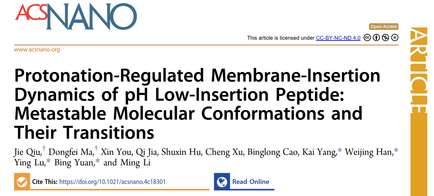 细胞膜与内源性和外源性分子的复杂相互作用是多种生物过程的基础,也为医疗发展提供了重要依据。其中,pHLIP多肽因其独特的pH响应特性成为研究分子跨膜机制的理想模型——它能在不破坏膜结构的情况下实现跨膜插入,在癌症诊断和药物递送领域具有广阔应用前景,目前多个变体已进入临床前测试阶段。近期研究利用停流圆二色谱、荧光光谱和固态核磁共振等技术,在揭示pHLIP跨膜插入途径方面取得突破,特别是发现了插入过程中的“中间态”及pH依赖的“热力学中间态”。然而,这些系综技术难以精确定位膜内中间态的位置、停留时间及其与热力学态的关联,也无法捕捉单个肽分子的动态变化。