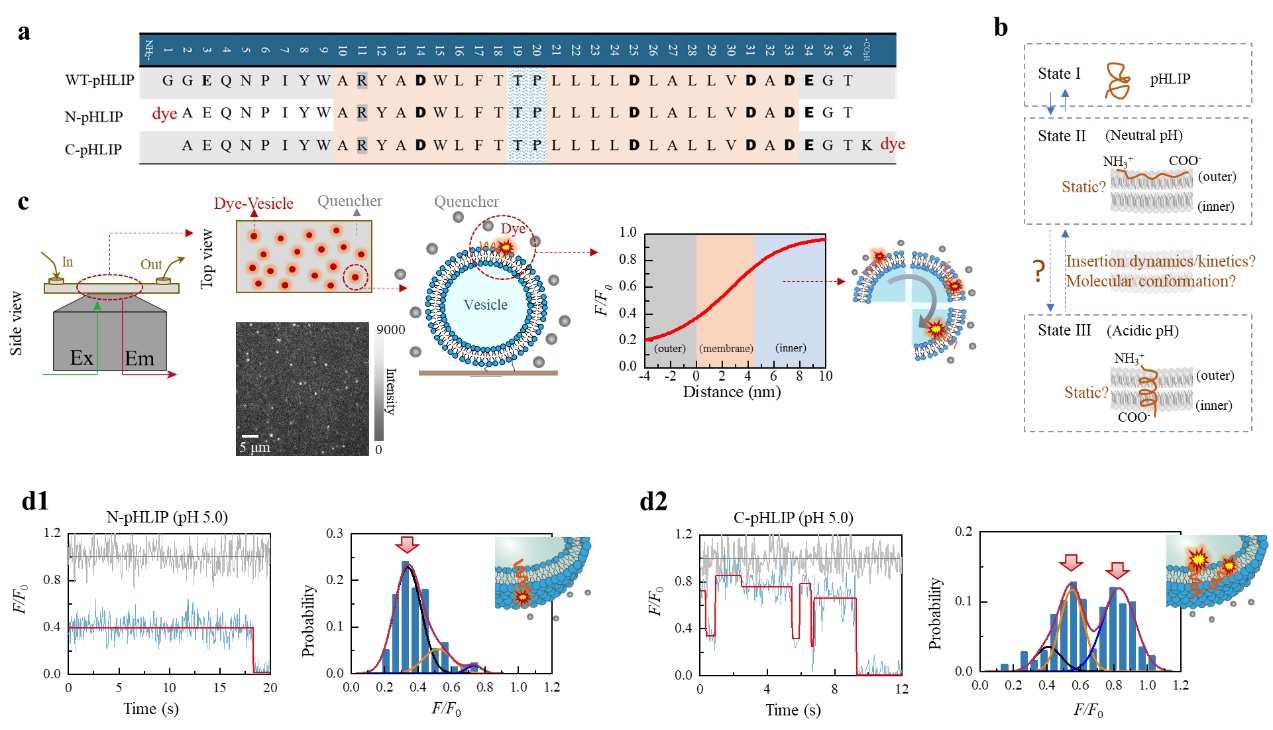 图1. (a) pHLIP多肽的序列;(b) 当前相关研究中面临的主要问题;(c) 借助LipoFRET技术,可通过单分子荧光强度的变化实时获取单分子跨膜深度的具体位置信息;(d1,d2) pHLIP多肽的N端与C端在细胞膜内呈现动态平衡状态