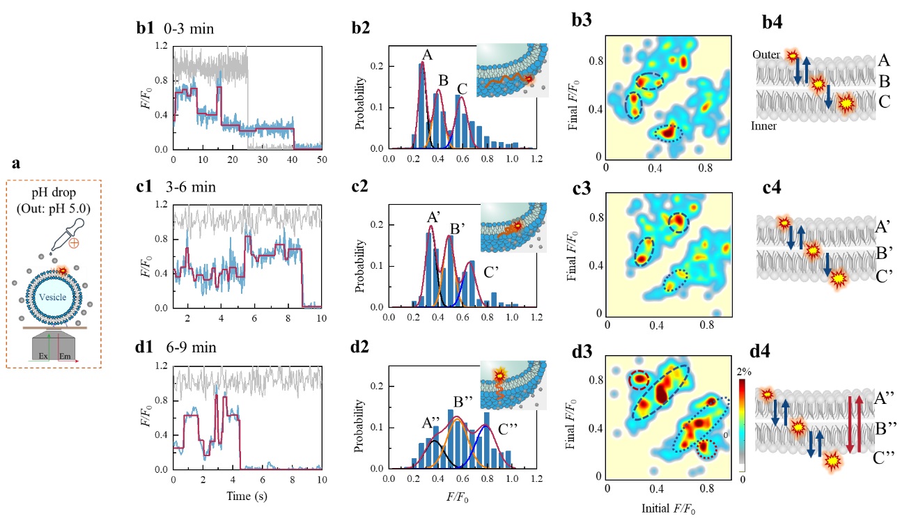 图2. (a) 实验设计的示意图;(b1-d1) 在将 pH 值从 7.4 调节至 5.0 后,分别于 0-3 分钟、3-6 分钟及 6-9 分钟时间段内捕获的代表性荧光强度曲线;(b2-d2) 上述时间区间内对应的荧光强度统计分布图;(b3-d3) 展示 C-pHLIP 在双层膜不同 z 深度之间转换的跃迁密度分布图;(b4-d4) 插膜态转变过程的示意图