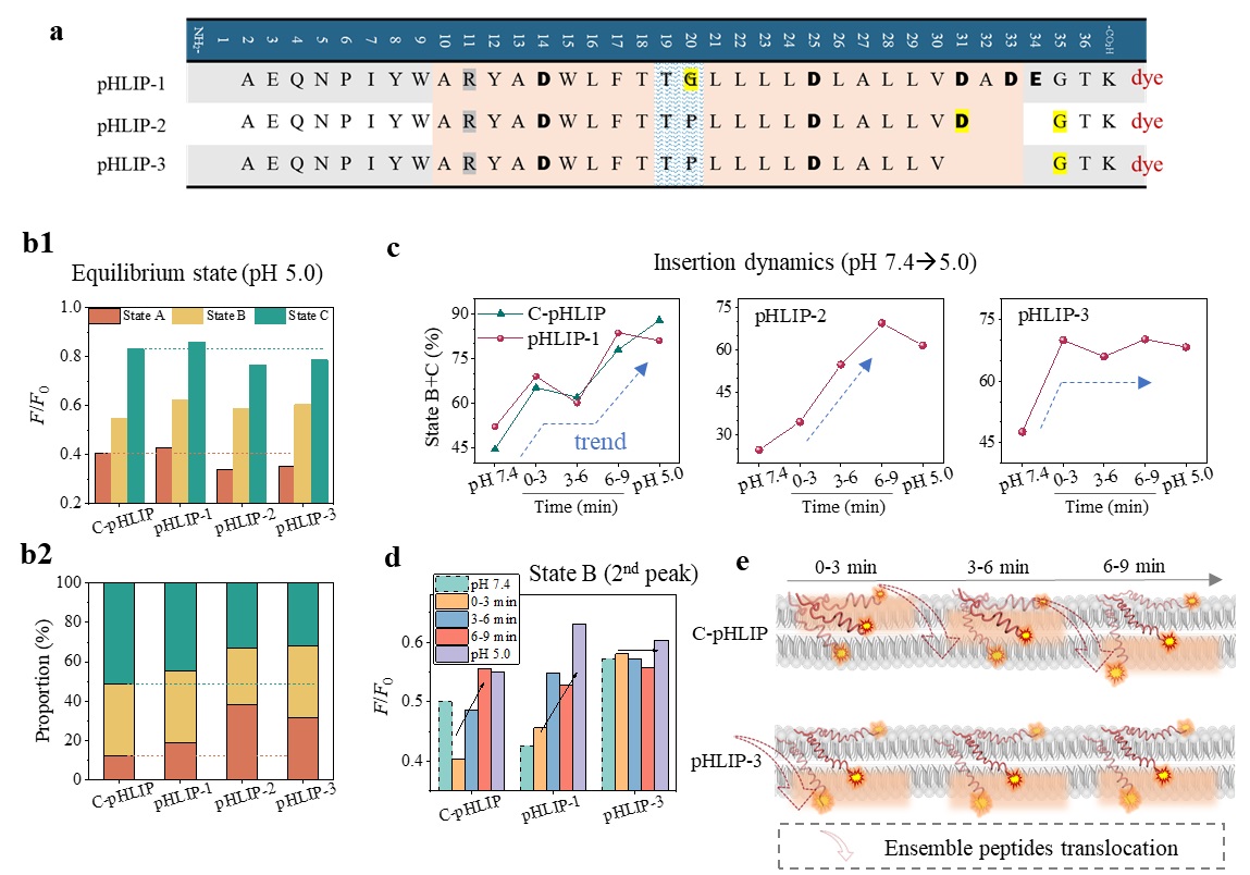 图3. (a)三种变体的序列;(b1,b2) 在pH 5.0条件下,野生型多肽及其三种变体在细胞膜内的亚稳态插膜深度与比例;(c,d) 多肽在pH值调节过程中膜插入状态的时间演变过程;(e)多肽逐渐渗透进入膜内的示意图
