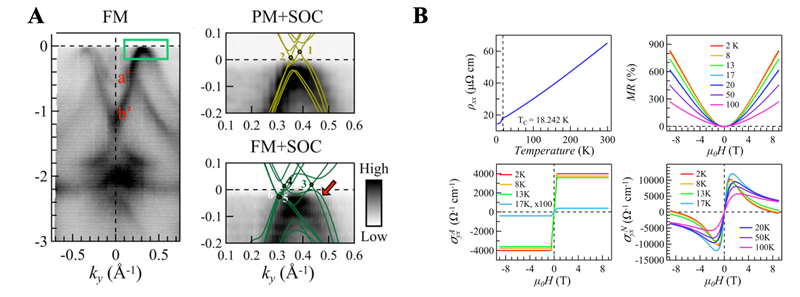 本次研究中,陈朝宇合作团队基于本征磁性拓扑材料RAlX (R = Ce, Pr, Nd, Sm; X = Si, Ge)体系,系统研究了PrAlSi在顺磁态和铁磁态不同温度下能带特征中外尔费米子的演化和霍尔输运中反?;舳绲己驼;舳绲嫉难莼?,发现磁有序对2种霍尔输运的影响显著而对外尔费米子的影响小到无法观测。如图1A所示,角分辨光电子能谱测量得到的PrAlSi的低能能带符合第一性原理计算得到的外尔锥的特征结构,但是从顺磁相到铁磁相的转变后却没有表现出相应的变化。这体现了体系的电子结构和长程磁序之间的解耦,有可能来源于低能能带和局限磁矩之间较弱的相互作用。与能带的表现相反的是,图1B中所示的电阻,磁阻,反常和正?;舳绲季逑殖雒飨缘奈露纫览?,并在居里温度处存在跳变,说明磁有序显著影响了体系的电子输运。