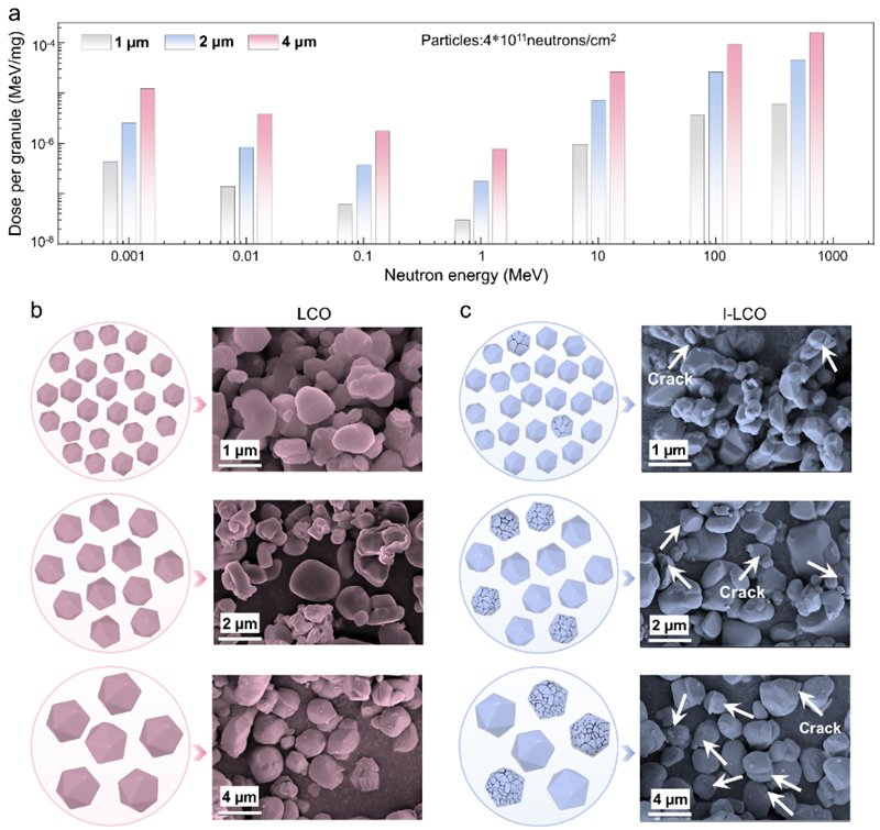 基于此,松山湖材料实验室中子科学-量子和能源材料团队在国际上率先开展锂离子电池中子辐照失效机制研究。研究表明,中子辐照可诱发钴酸锂正极材料产生微裂纹,并使晶体内部应力显著增加。同时,中子辐照还会诱发锂离子迁移,破坏材料原有的锂亚晶格结构。进一步,原位中子辐照实验表明,中子辐照可加速材料的层间滑移,且这种滑移现象随着锂离子脱/嵌程度的增加而加剧。更为重要的是,研究人员发现材料的辐照损伤程度取决于其单晶粒径-粒径越小,辐照损伤越小。该研究不仅揭示了中子辐照诱导的新型电池失效机制,同时为开发面向极端工况的抗辐照正极材料提供了理论基础。