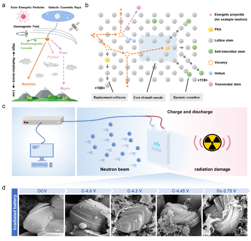 图1 (a)宇宙射线与航天器相互作用产生的空间辐照效应;(b) 中子辐照诱导晶体结构缺陷的微观损伤机制;(c) 原位中子辐照软包电池测试示意图;(d) 不同荷电状态下辐照电池中钴酸锂正极的结构演变。