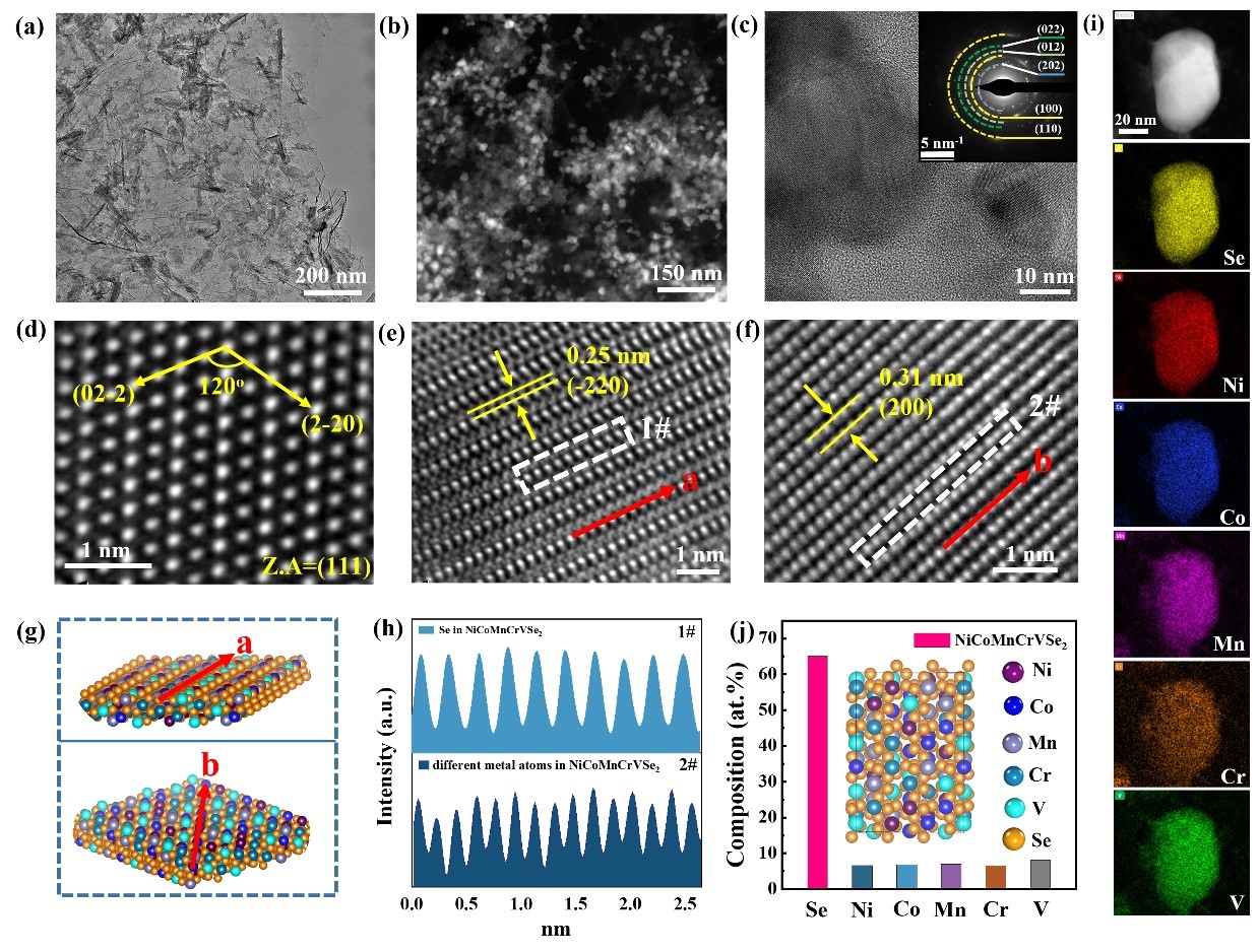 图1 NiCoMnCrVSe2/G催化剂的形貌与微观结构。(a) TEM图;(b) HAADF-STEM图;(c) HR-TEM图(插图:从(c)区域获取的SAED图案);(d-f) 球差校正HAADF-STEM图像;(g) 模拟原子模型;(h) 沿(e-f)图中白色方框区域内进行线扫描的强度分布图;(i) STEM-EDS元素分布图;(j) 不同元素含量的ICP-OES结果(插图:NiCoMnCrVSe2的原子模型)。