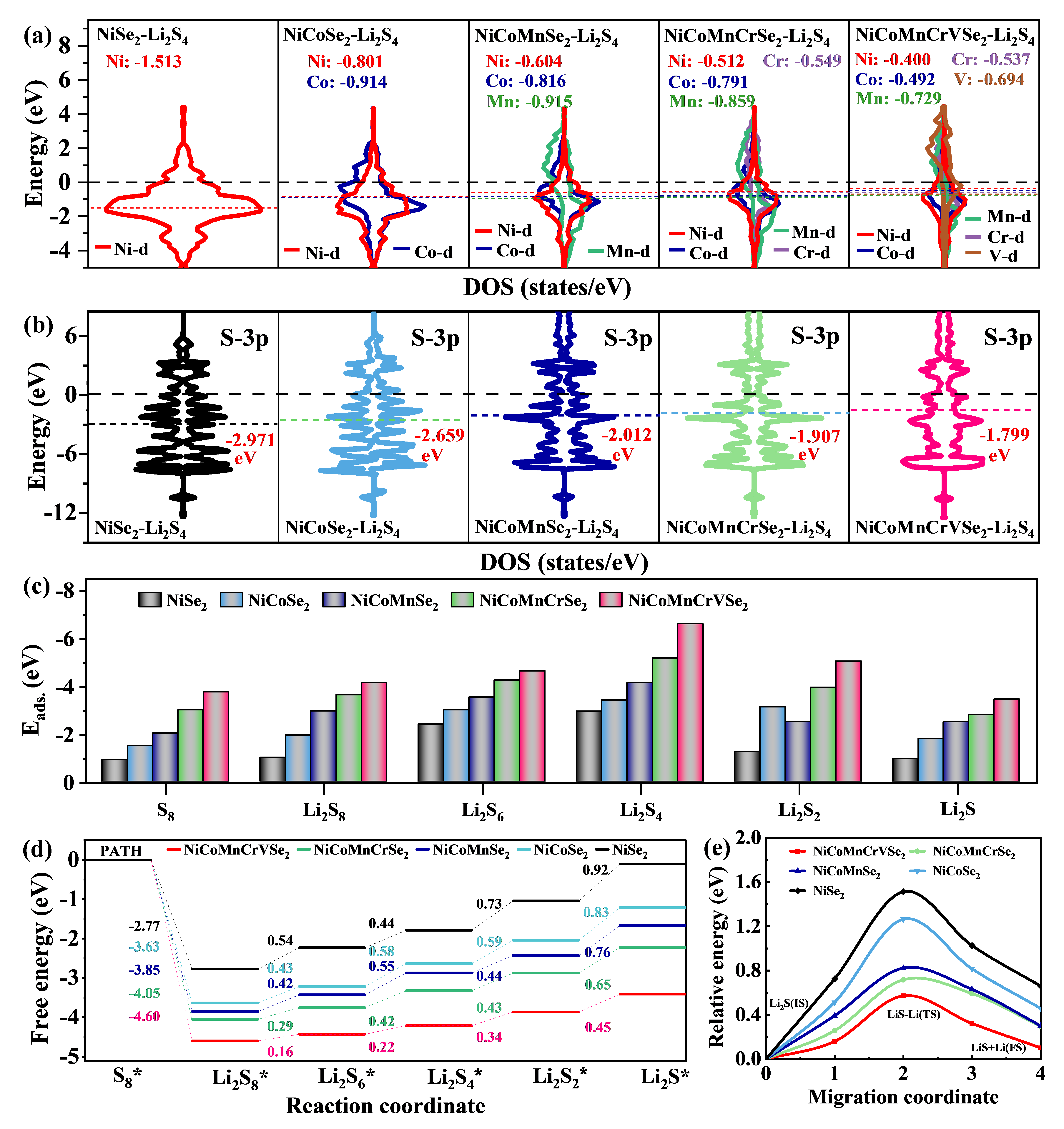 图2 (a) NiCoMnCrVSe2-Li2S4、NiCoMnCrSe2-Li2S4、NiCoMnSe2-Li2S4、NiCoSe2-Li2S4和NiSe2-Li2S4的PDOS及对应的d带中心;(b) Li2S4吸附在不同TMSe2催化剂表面上的S 3p能带结构;(c) 不同LiPSs与各个TMSe2催化剂之间的吸附能计算结果;(d) LiPSs在不同TMSe2催化剂上被还原的吉布斯自由能垒图;(e) Li2S在不同TMSe2催化剂表面分解的能量路径