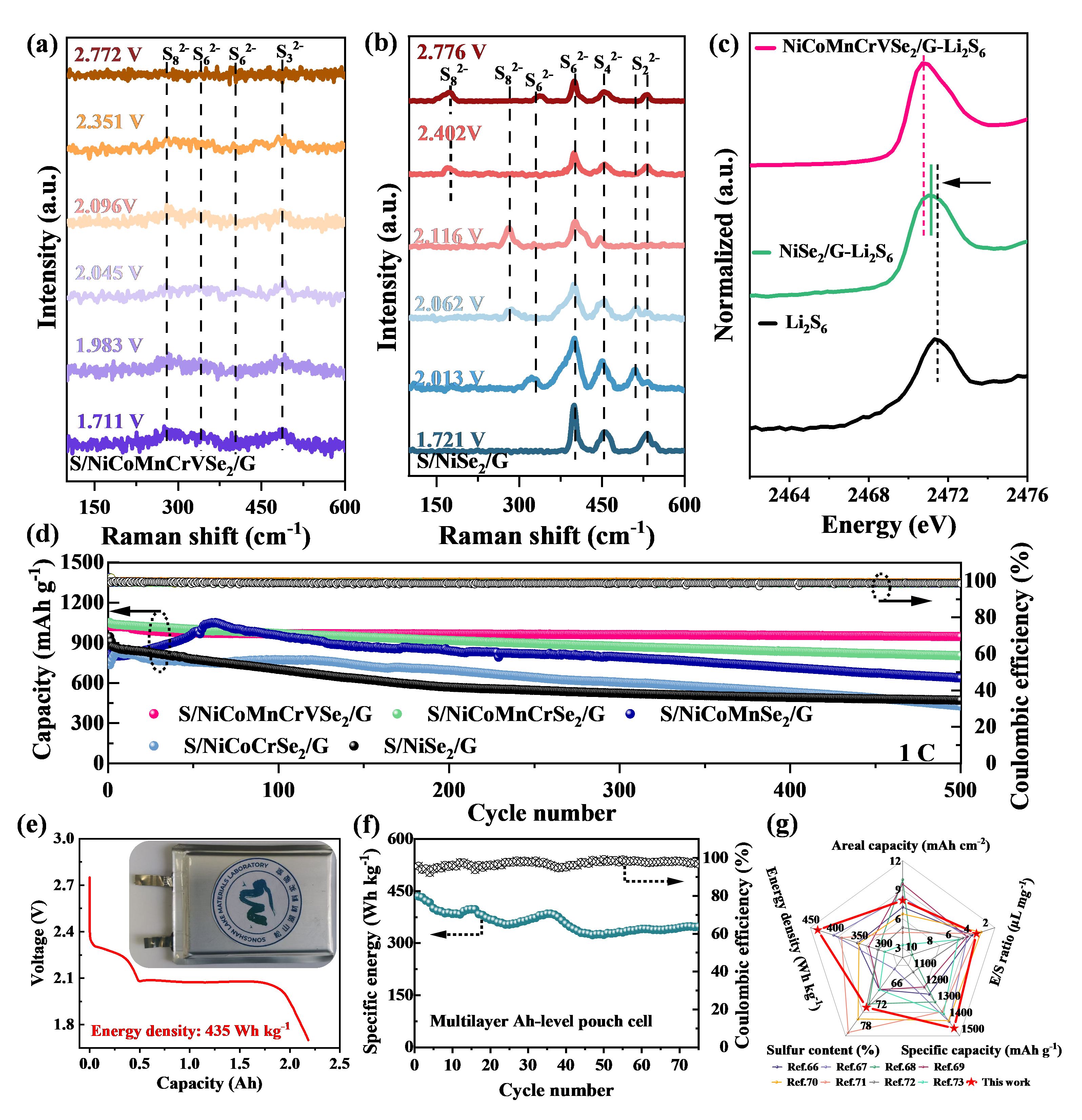图3 (a) S/NiCoMnCrVSe2/G和 (b) S/NiSe2/G电池在0.4 C放电过程中负极侧的原位拉曼光谱;(c) Li2S6、NiSe2/G-Li2S6和NiCoMnCrVSe2/G-Li2S6中S的K边XANES光谱; (d) 在1 C倍率下含不同催化剂硫复合正极(S负载:1.2 mg cm-2)的长循环稳定性;(e) 含有2.69 g硫的锂硫软包电池照片及放电曲线;(f) 在0.1 C倍率下测试的多层软包电池的循环稳定性;(g) 本研究中锂硫软包电池性能与近期报道文献中其它研究的综合比较。