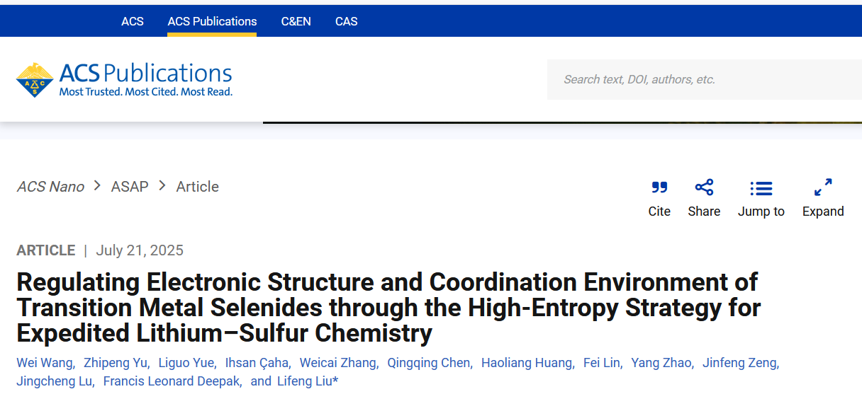 本工作以“Regulating Electronic Structure and Coordination Environment of Transition Metal Selenides through the High-Entropy Strategy for Expedited Lithium–Sulfur Chemistry”为题于2025年7月21日发表在领域内知名期刊ACS Nano上。能源转换与存储材料团队博士后王伟为文章的第一作者,团队刘利峰研究员为文章的通讯作者,松山湖材料实验室为文章的第一通讯单位。