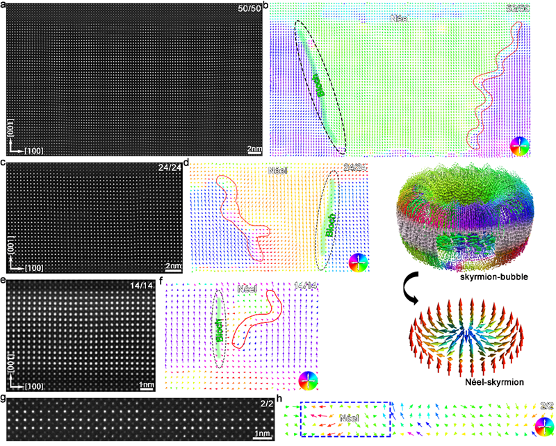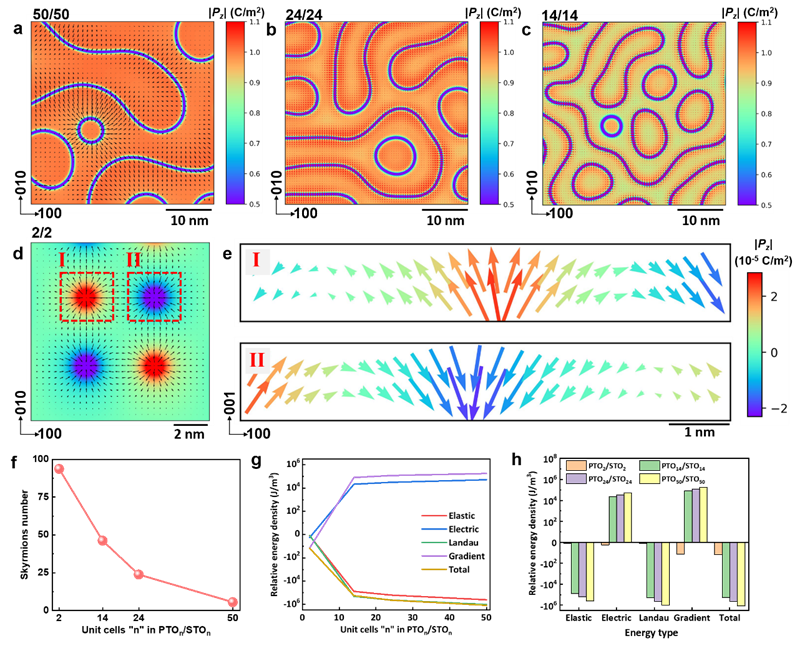 在过去的五年中,人们从实验和理论两个方面对铁电斯格明子-泡泡(ferroelectric skyrmion-bubbles)进行了系统性探索,揭示了斯格明子-泡泡的形成是由块体能、梯度能、弹性能和静电能之间复杂相互作用共同决定的。这些斯格明子-泡泡展现出了诸如手性、负电容效应以及拓扑相变行为等。然而,与Dzyaloshinskii-Moriya相互作用不同,偶极子-偶极子相互作用是无手性的,这意味着它们在能量上更倾向于形成布洛赫型斯格明子。铁电奈尔型斯格明子的形成需要显著的电荷积累,以补偿电极化径向梯度的散度。畴结构工程是在单层四方铁电薄膜中实现多样化、弱化奈尔型和布洛赫型相关性的一种可行策略。因此,先前的理论研究曾提出奈尔型斯格明子存在的可能性较低,这也使得探测与研究它们更具有挑战性。在此,我们通过研究[(PbTiO3)n/(SrTiO3)n]1双层膜中斯格明子-泡泡随厚度的演化(图1),观察到在厚度为2个单胞的超薄双层膜中纯奈尔型斯格明子的原子形态,其拓扑荷为±1。通过极化分析、几何相位分析和X射线3D倒易空间映射(RSM)相结合的实验手段,确认了这种纯奈尔型斯格明子的存在。我们发现,当双层膜的厚度从50个单胞降低到2个单胞时,同时具备奈尔和布洛赫特征的斯格明子-泡泡结构中的布洛赫特征完全消失,仅保留纯奈尔型斯格明子特征(图2)。通过相场模拟揭示了奈尔型斯格明子的形成机制,计算表明静电能和梯度能变化在稳定奈尔型斯格明子相中起到了关键作用(图3)。这些纳米尺度的纯奈尔型斯格明子代表了磁性对等物的电学等价物,拓展了拓扑相的尺寸极限,并为铁电物理学领域的进一步发展提供了潜在的推动力。
