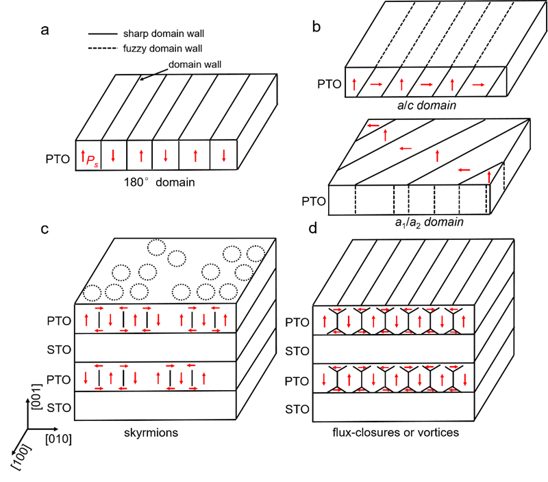 图4 对比分析铁电畴(180°畴)、铁弹畴(a/c, a1/a2)和拓扑畴(斯格明子-泡泡, 全闭合或涡旋)的形貌特征