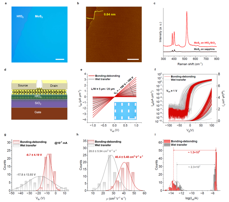 除了进行二维半导体叠层制备,直接键合-解键合方法还可以实现各种单层二维半导体从蓝宝石衬底到高κ介质(HfO2,Al2O3等)衬底的直接转移,且保留其本征电学性能(图4)。与常规湿法转移样品相比,键合-解键合转移的样品具有洁净的界面,从而使制备的场效应器件具有更高的迁移率、更大的开态电流和更小的阈值电压涨落,展示出直接键合方法的优越性。
