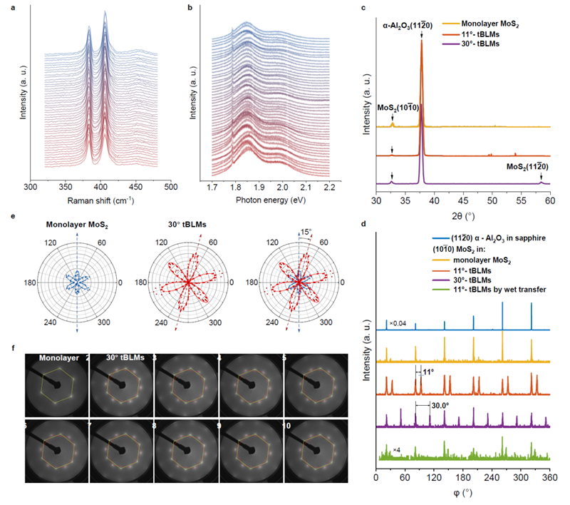 针对此挑战,团队开发的直接晶圆键合及解键合方法,可在真空或手套箱中进行,无需转移介质,可实现超洁净表面/界面和晶圆级均匀的转角。从蓝宝石表面外延的单层二硫化钼和二硒化钼等晶圆级二维半导体出发,该方法可制造多种同质和异质叠层晶圆。如图1所示。原子力显微镜、扫描透射电子显微镜、拉曼光谱、X 射线衍射、低能电子衍射和二次谐波等表征结果显示,所制备的二维半导体叠层具有高质量、超洁净表面/界面以及晶圆级均匀的层间转角(图2和图3)。
