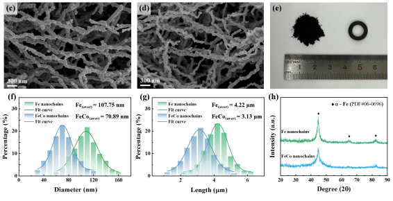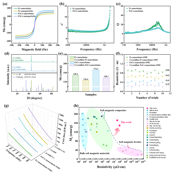 近日,松山湖材料实验室汪卫华研究员、柯海波研究员和重庆师范大学余鹏教授团队共同合作,制备出一种具有“自隔离纳米链”结构的Fe/FeCo纳米链软磁复合材料,表现出超过1 GHz的磁导率稳定性、显著的饱和磁化强度(Fe: 149.2 emu/g; FeCo: 172.1 emu/g)与电阻率(Fe: 0.86 Ω·m; FeCo: 0.41 Ω·m)。此外,这种Fe/FeCo纳米链软磁复合材料在高频场合(1 MHz,20 mT)下表现出极低的磁芯损耗(Fe: 446.86 kW/m3; FeCo: 564.43 kW/m3)。