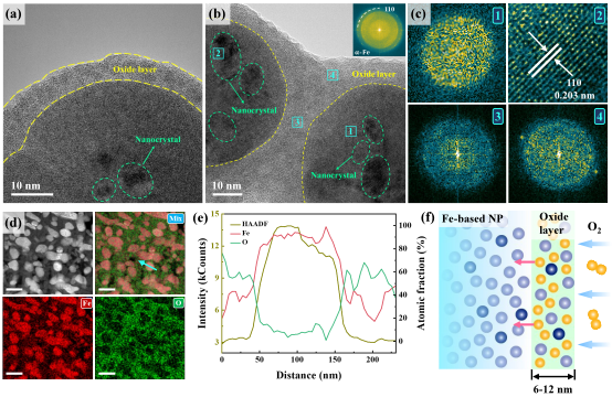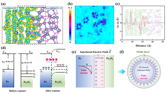 研究团队通过磁场辅助化学合成与原位氧化相结合的方法制备出具有“自隔离纳米链”结构的Fe/FeCo纳米链?;Щ乖腇e/FeCo纳米颗粒自组装成链状结构,自发形成的高电阻率氧化物层提供电隔离,而无需传统的厚涂层。这种Fe基纳米链软磁复合材料可在低温低压下成型,大大简化了制备工艺。至关重要的是,这种自隔离结构将交变磁场下的主要涡流限制在颗粒内部,有效抑制涡流损耗,同时保留沿链轴的强颗粒间磁耦合(图1)。通过透射电子显微镜(TEM)可观察到这种Fe基纳米链表现出非晶态基底结构,并伴有少量的晶化行为。Fe基纳米链在自然条件形成的高电阻率氧化层(6-12nm)将Fe基纳米颗粒有效隔离(图2)。通过X射线光电子能谱(XPS)实验可以推断纳米链表面形成的氧化层主要成分为(Fe3O4和α-Fe2O3)。TG-DSC同步热分析实验表明,与无序团簇的Fe基纳米颗粒相比,结构规则统一的Fe基纳米链具有更高的热力学稳定性,其在485 ℃以下未有明显的氧化行为(图3)。电磁学性能测试表明,Fe/FeCo纳米链具有超过1 GHz的磁导率稳定性、显著的饱和磁化强度(Fe: 149.2 emu/g; FeCo: 172.1 emu/g)与电阻率(Fe: 0.86 Ω·m; FeCo: 0.41 Ω·m)。这种优异的性能组合超过绝大多数已报道的软磁材料。源于其独特的自隔离结构,这种Fe基纳米链软磁复合材料表现出极低的高频磁芯损耗(Fe: 446.86 kW/m3; FeCo: 564.43 kW/m3),显著低于商用的微米软磁复合材料(图4)?;诘谝恍栽淼募扑憬峁砻?,Fe基非晶/晶体界面处的电荷重组可增强其自旋极化,从而增强材料的磁性能。非晶/晶体复合结构中单位体积的净磁矩分别比纯非晶结构和纯晶体结构高7.9%和9.5%(图5)。非晶态金属Fe与氧化物Fe界面处存在电荷迁移,从而形成界面电场,该电场会阻碍涡流穿过金属-氧化物界面。因此,这种Fe基自隔离纳米链结构表面的氧化层会将交变磁场下的主要涡流限制在Fe基纳米颗粒内部(图6),特别是在高频场合下会表现出显著的优势。