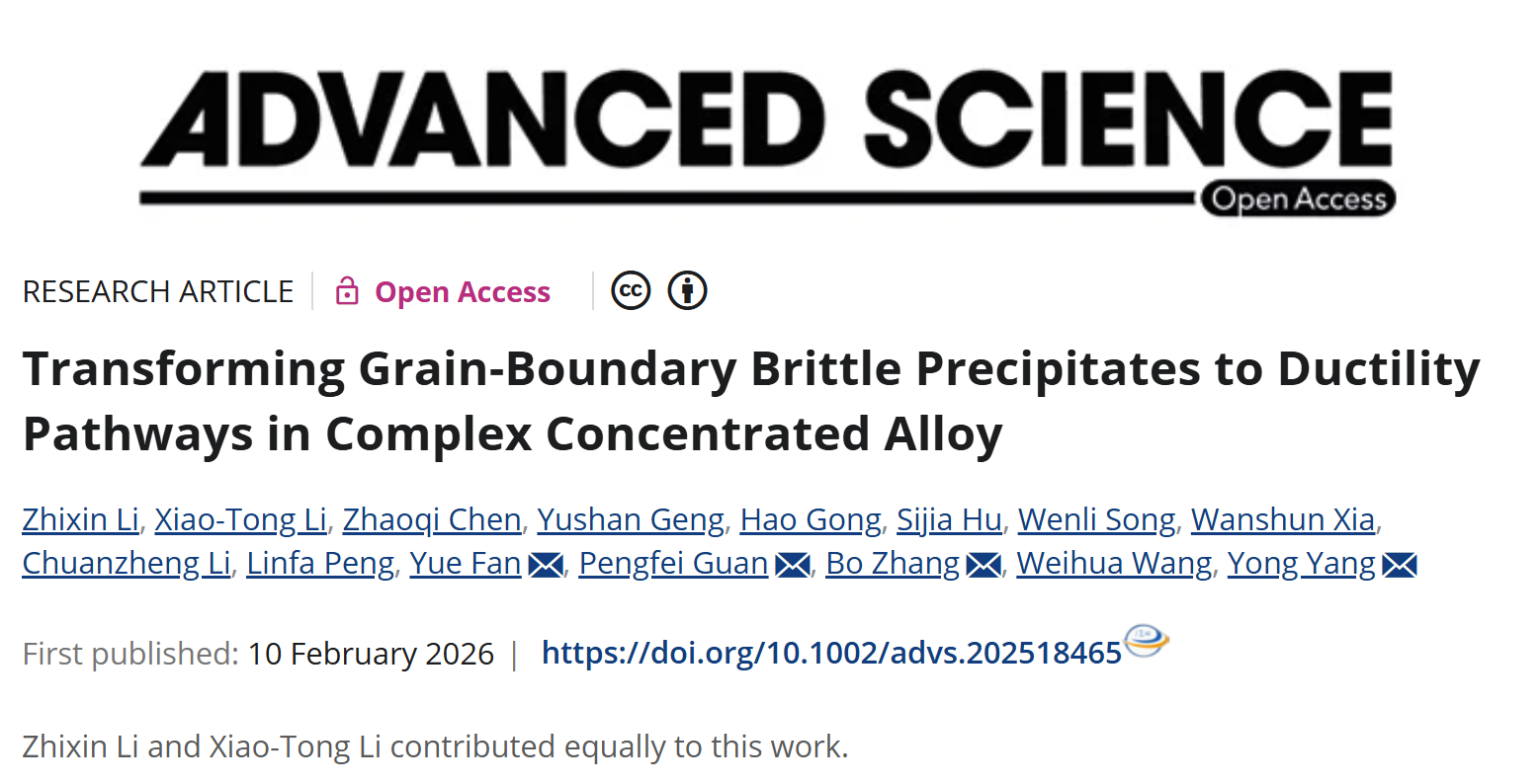 2026年2月10日,松山湖材料实验室空间材料团队在国际顶级期刊《Advanced Science》在线发表最新研究进展——《Transforming Grain-Boundary Brittle Precipitates to Ductility Pathways in Complex Concentrated Alloy》。该工作通过原子尺度梯度界面工程的创新策略,颠覆了晶界脆性析出相导致材料脆化的传统认知,成功将复杂成分合金中晶界脆性相转化为塑性通道,实现了高强度与高塑性的优异协同,为析出强化合金突破强度-塑性权衡难题提供了通用化的材料设计方法,也为极端环境结构材料研发开辟了全新路径。