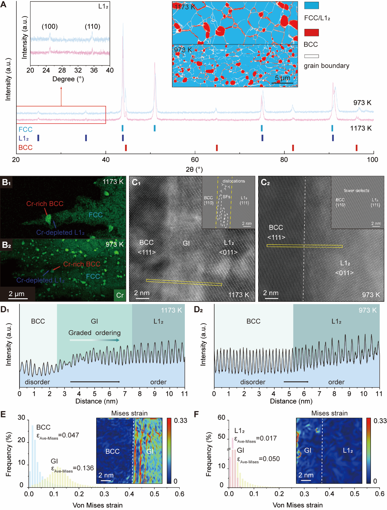 针对这一关键挑战,空间材料团队跳出“抑制脆性相形成”的传统思维,提出“改造脆性相界面使其成为塑性通道”的全新思路。团队先基于机器学习框架,筛选出无贵重金属添加的Ni??Cr??Al??Fe?条幅分解合金作为模型体系,再通过精准调控冷轧+退火的热机械处理工艺,在脆性BCC相和L1?相间构建出成分与结构梯度界面(GIs),其中1173 K退火制备的5~12 nm宽扩散型梯度界面,成为实现材料性能突破的关键结构(图1)。
