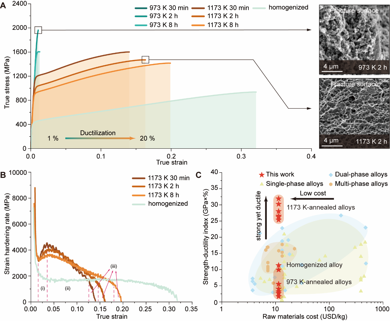 图2. 合金室温拉伸性能及与传统合金的强塑-成本对比