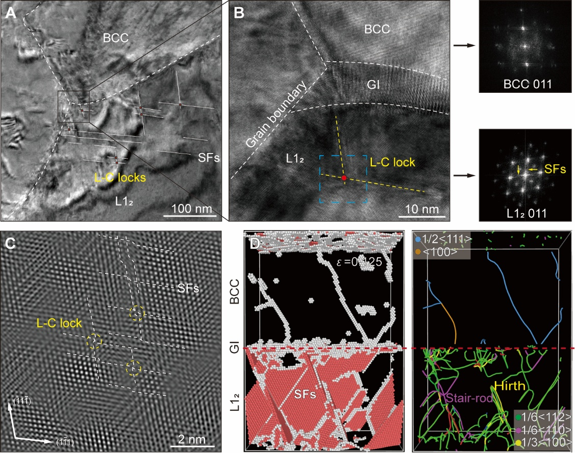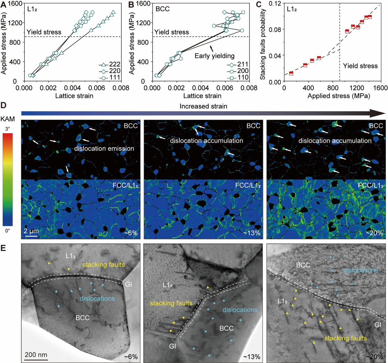 研究团队通过室温拉伸测试、原位中子衍射拉伸表征、高分辨电镜分析结合分子动力学模拟,系统验证了梯度界面改性后合金的优异性能与内在变形机制。该梯度界面工程改性后的复杂高熵合金,实现了~1.2 GPa超高屈服强度与~20%高总延伸率的强塑协同,性能远超传统析出强化合金;同时因无贵重金属添加,兼具低成本优势,且展现出卓越的热稳定性,在0.72T?高温下长时间退火120 h后,仍能保持1.42±1.37 μm的超细晶结构,晶界无明显粗化(图2)。这一卓越性能源于梯度界面诱导的相间顺序塑性激活与动态应力再分布机制:梯度界面下BCC脆性相率先屈服,位错先在BCC相中形核发射,随后应力触发相邻L1?相的堆垛层错增殖,实现软硬相间的协调变形;而L1?相内形成的拓扑壁垒(层错,位错)会将应力重新分配回BCC相,形成持续的应变硬化循环,从根本上避免了晶界脆化引发的裂纹萌生与扩展(图3,图4,图5)。