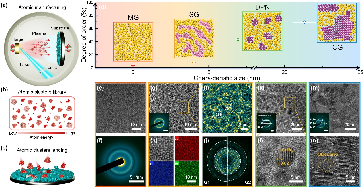 图1. 原子制造策略及通过调控参数获得的四种典型纳米结构:金属玻璃、Spinodal玻璃、双相纳米结构和晶态-玻璃复合材料