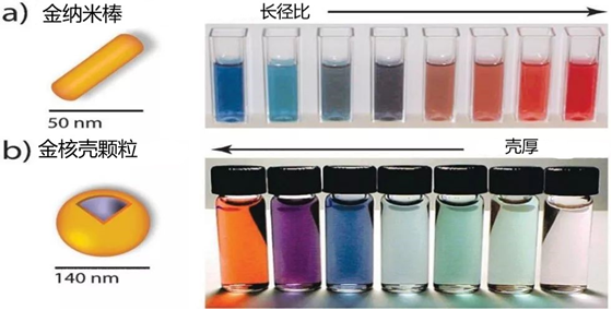 当然,物体的尺寸也可以带来外观颜色的改变,块体金是黄色,当尺寸减小到胶体金可以呈现不同的颜色,当尺寸小于光波的纳米结构的金颗粒就变成了黑色。不同尺寸形貌的金对可见光有选择性吸收,吸收了某个波长的光后,将没有吸收的光反射出去,我们看到的就是反射的光的颜色,当纳米尺寸的金结构影响了光线的吸收反射,如没有或极少量的反射时,我们看到的纳米金就是黑色。但是金胶体溶液中金的粒子尺寸一般在1-100nm之间,随粒径和形貌的变化呈现不同的颜色(如图)。