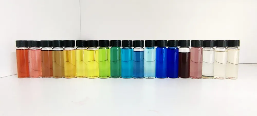 例如,过渡金属离子溶液往往以配合物的形式存在(水合物、氰合物、氨合物),他们在形成络合物的而过程中会伴随着d轨道能级分裂,d轨道的电子在光照下吸收了能量后从低能级d轨道跃迁到高能级d轨道,称之为d–d跃迁。若d–d跃迁所需能量恰好在可见光能量范围内,即d电子在跃迁时吸收了可见光部分波段的光,则溶液就会显示其互补颜色。若d–d跃迁吸收的是紫外光或红外光,则化合物不显色。