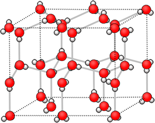 冰的六方晶体结构,红色为氧原子,白色为氢原子